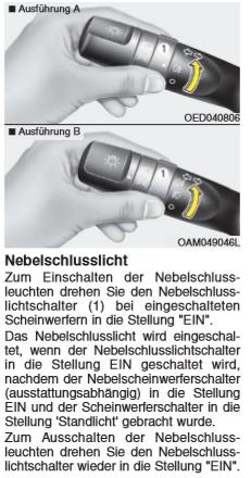 Die Nebelschussleuchte muss also zwingend nach Anleitung, wie oben beschrieben, ausgeschaltet werden. Bitte beachten! |