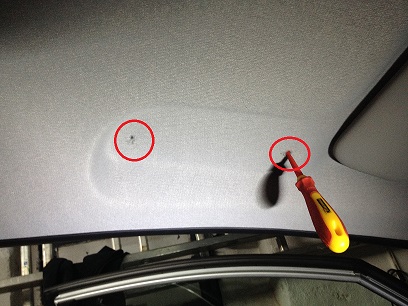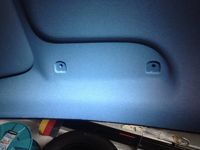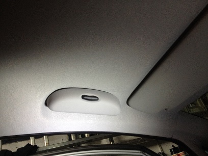 Jetzt die Maße von der Beifahrerseite zur Fahrerseite übernehmen und mit einer Nadel oder kleinem Schraubendreher die Gewinde suchen bzw. ertasten. Den Himmel nur wenig aufschneiden. Also, einfach nur die Löcher etwas größer machen so das die Schrauben gut durch den Stoff gehen. Wer sich traut kann auch die Löcher im Himmel so groß machen, dass die Füße vom Brillenfach in den Himmelstoff verschwinden. (Wie auf der Beifahrerseite beim Haltegriff) |