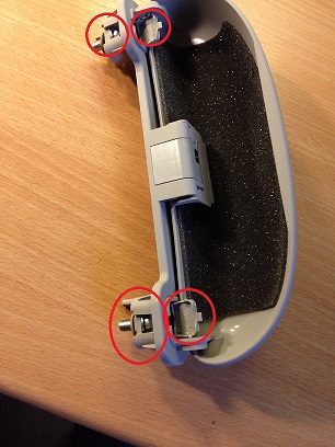 Hier müssen die Füße absägt werden. Dadurch halten aber jetzt die Schrauben nicht mehr. Größere „Unterlegscheiben“ verhindern das Durchfallen der Schrauben und geben dem Brillenfach stabilen Halt. |