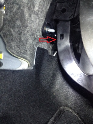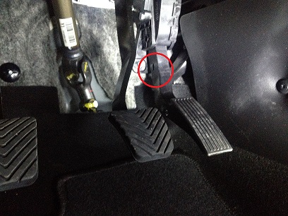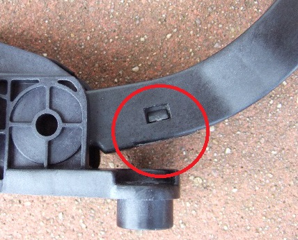 Gaspedal ausbauen. Stecke vorher abziehen! Kurz unterhalb des Potigehäuses sitzt ein kleiner Plastiknippel, der beim Durchtreten gegen die Trägerplatte drückt und den „Klick“ auslöst. |