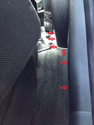 Die Seitenabdeckung ist mit zwei Klammern befestigt. Zuerst die Abdeckung nach innen also rechts abziehen. (Pfeil) An der oberen Stelle ist die Abdeckung besonders fest. In dem Fall ein Kunststoffhebelwerkzeuge ansetzen. Man muss sehr kräftig ziehen. (Aber nicht mit roher Gewalt) Hinten am Fußende ist die Abdeckung nur in eine Führung gesteckt. Also keine Klammer! |