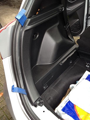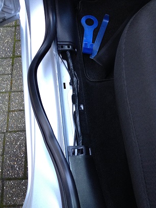 Zum Kofferraum einfach das Kabel unter der Abdeckung B-Säule schieben und weiter bis zum Kofferraum. Hier sind auch noch Kabel unter den Sitz bzw. zum Mitteltunnel verlegt.