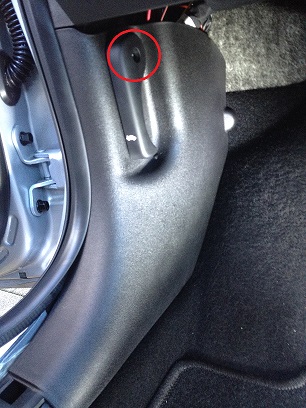 Besser und einfacher geht es von innen. Die kleine Kabeldurchführung befindet sich neben dem Kupplungspedal. Von hier aus durchstechen und das Kabel in den Motorraum schieben. Hier sind es das rote und gelbe Kabel.