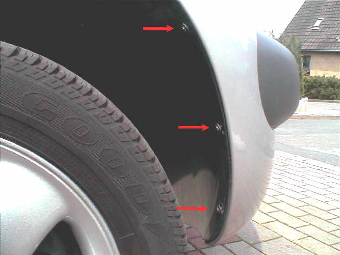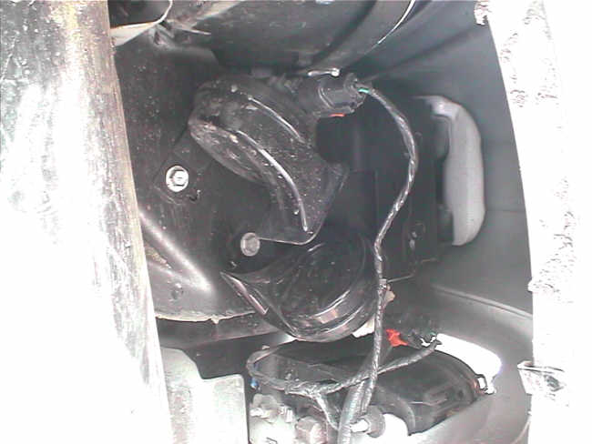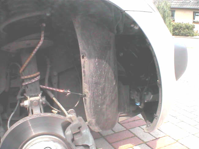 Die Hupen (es sind zwei) sitzen hinter der rechten vorderen Radverkleidung über dem Nebelscheinwerfer. Die drei Schrauben am Kotflügel lösen und die Verkleidung bei abgebautem Vorderrad nach hinten klappen.