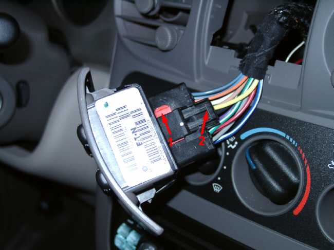 Den roten Sicherungsklipp (1) nach oben schieben, die Klammer (2) zusammendrücken und den Stecker abziehen.